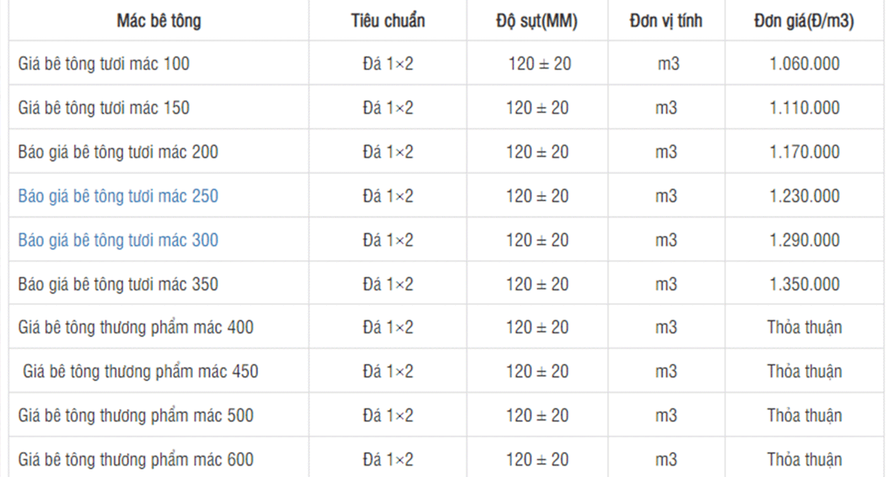 Dựa vào biến động thị trường, kết cấu các hạng mục công trình cũng như yêu cầu của quý khách đối với sản phẩm mà giá giá thành 1m3 bê tông tươi từng thời điểm cũng như từng mục đích sử dụng sẽ có các mức giá khác nhau. Bảng giá 1m3 bê tông tươi chúng tôi đề cập dưới đây lưu ý chỉ mang tính tham khảo, do đó để có đơn giá 1m3 bê tông tươi chính xác và giá tốt nhất thị trường hãy liên hệ với phòng kinh doanh Công ty xây dựng Trung Nguyên JSC theo Hotline: 02692 460 769.